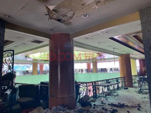 从现场图看,酒店内部设施凌乱,地面堆放着此前遗留的杂物,天花板也出现剥落,显得十分破落。
