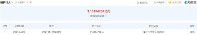 楼市君通过天眼查了解到,在该案件中,肇庆星湖俱乐部被执行总金额达约3.13亿元。