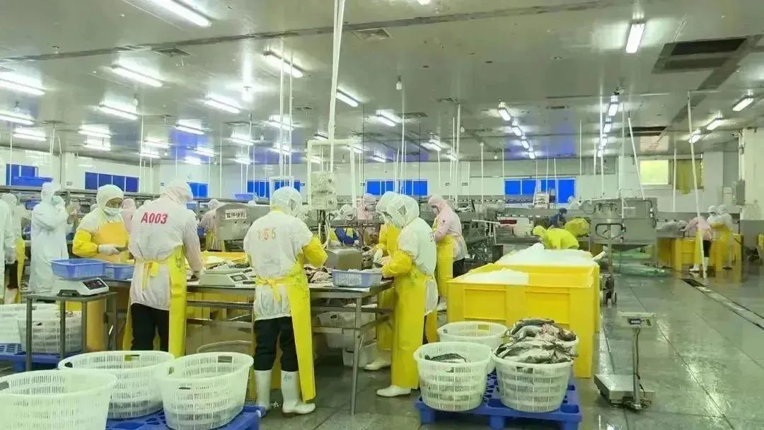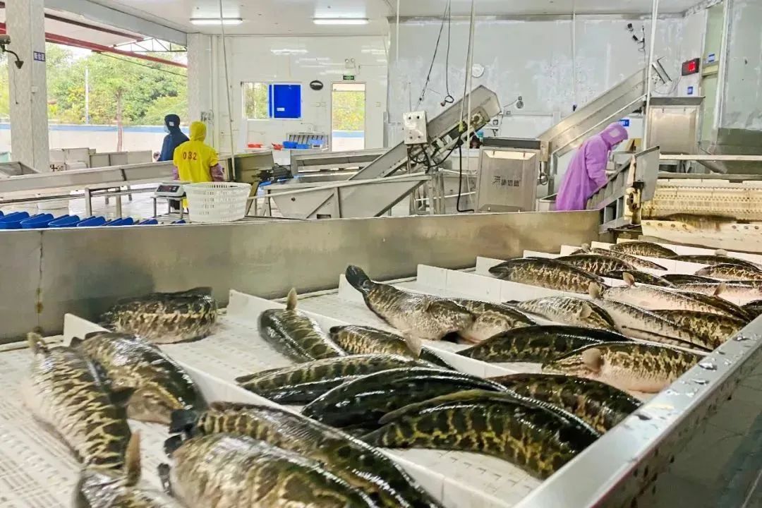 △肇庆恒兴水产科技有限公司生产区域内,一条条活蹦乱跳的新鲜活鱼被有序运往生产线。